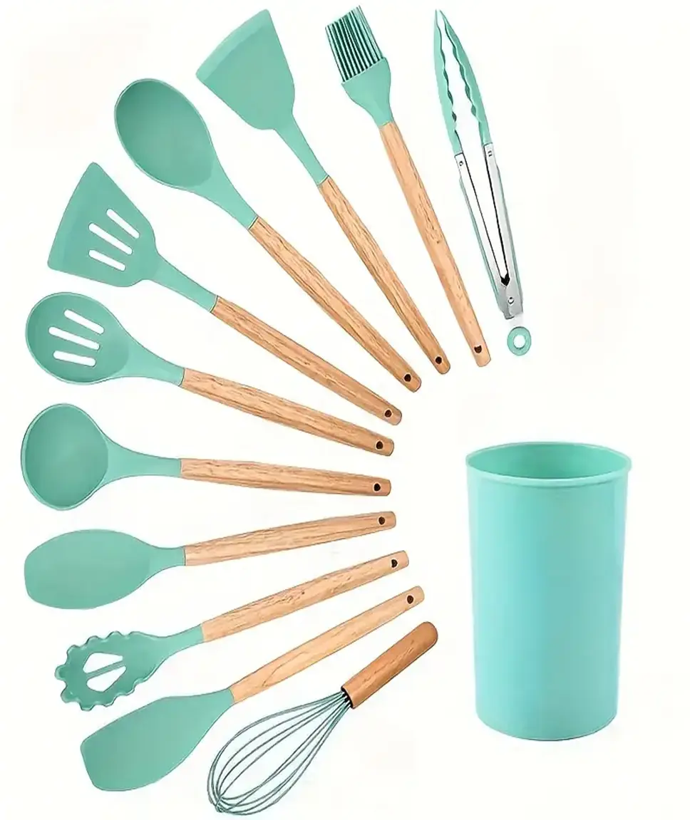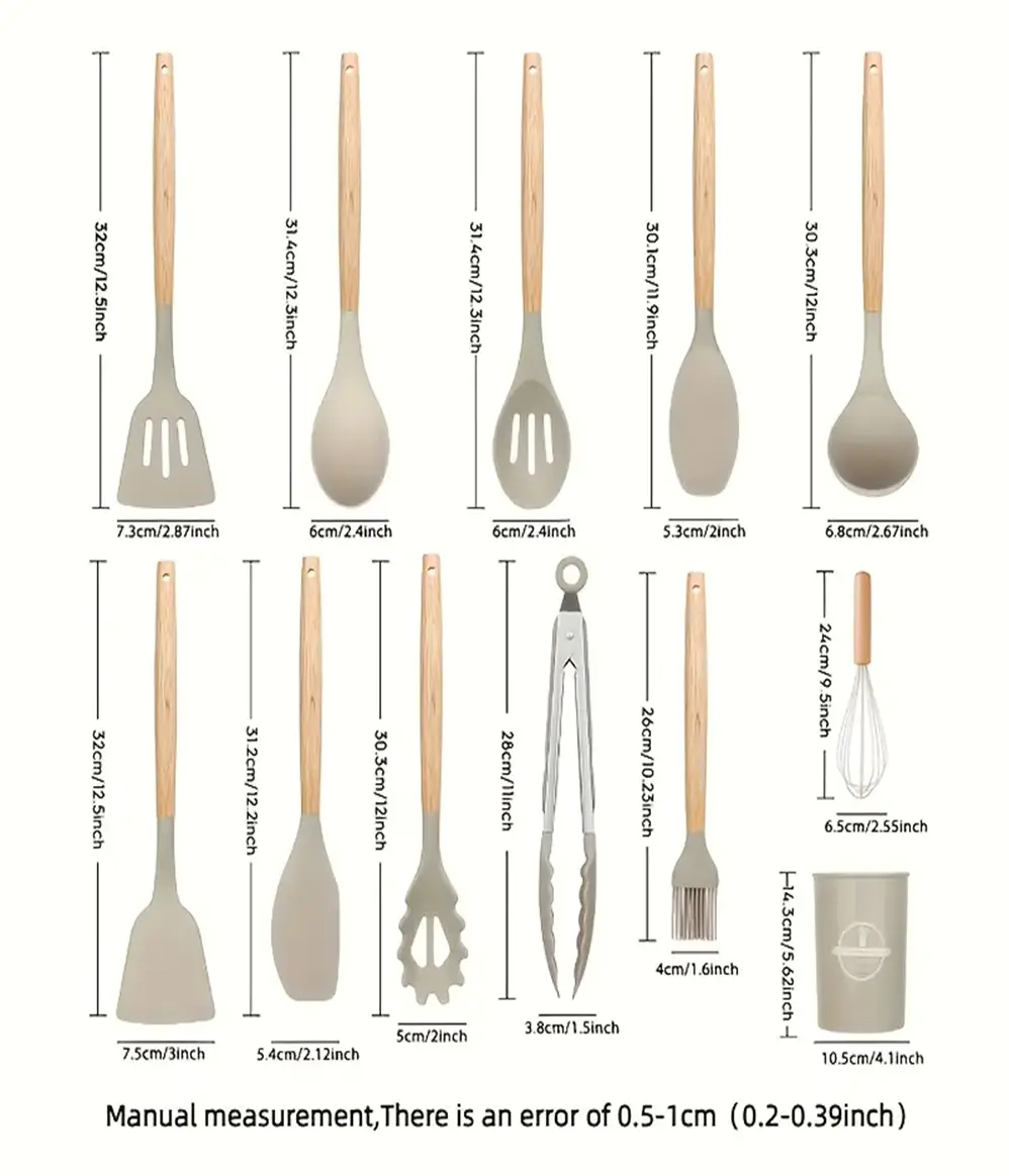 Descripción Características:Excelente calidad.11 elementos + 1 contenedor de almacenamiento.Antiadherente y fácil de limpiar. Diseño estético.Especificación del producto:Material: Silicona de grado alimenticio.Mango: Madera natural pulida. Medidas Convierte cada receta en una experiencia deliciosa y profesional. ¡Equipa tu cocina con lo mejor y cocina como un chef! 👩🍳🔥