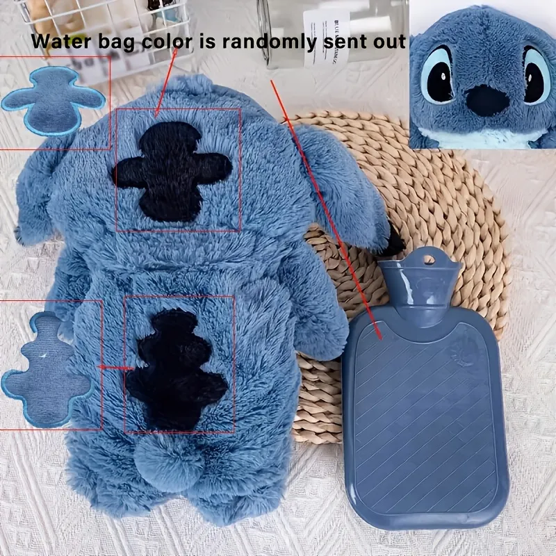 Su diseño incluye la figura del personaje de Disney Stitch, con una funda a menudo extraíble y lavable. Se utiliza para aliviar dolores musculares, cólicos o simplemente para mantenerse caliente, y puede ser un regalo tanto para niños como para adultos.