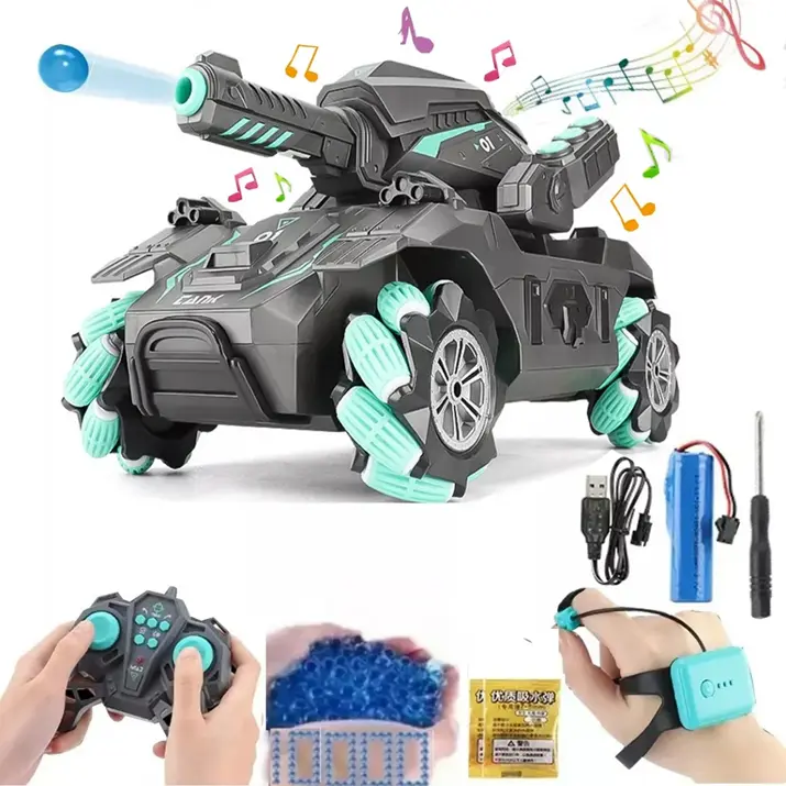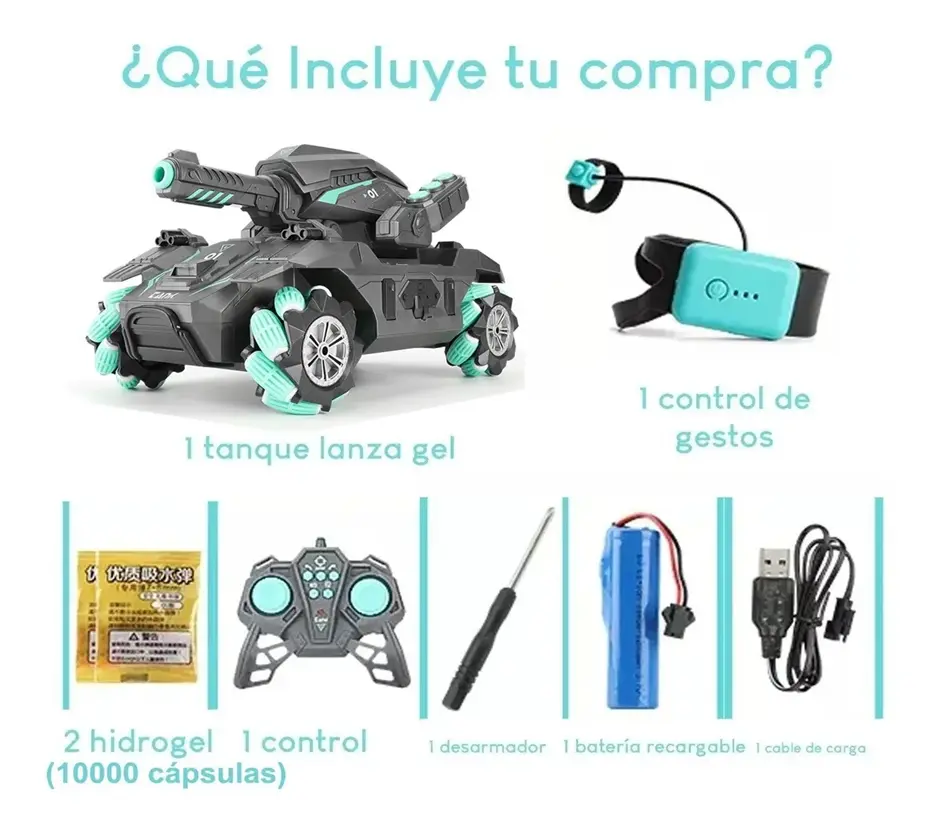 Incluye: 1 tanque RC, 1 control remoto, 1000 bolas de gel, cargador USB y manual.